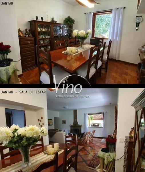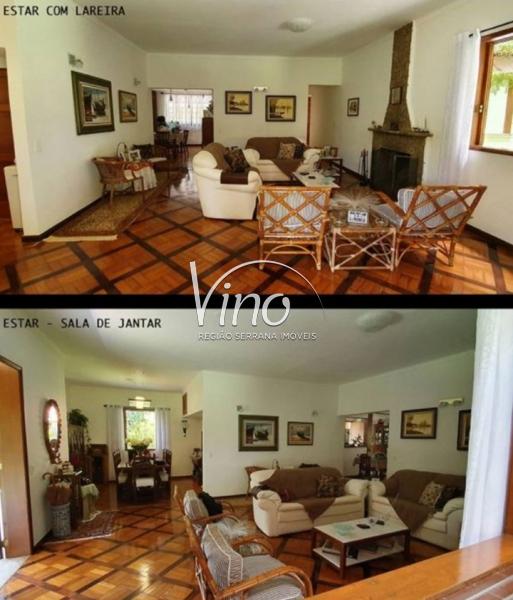 Sala em dois ambientes com lareira e piso de madeira. Copa, cozinha, lavanderia, dispensa, 3 quartos (sendo uma suíte no segundo andar), escritório, lavabo e banheiro.